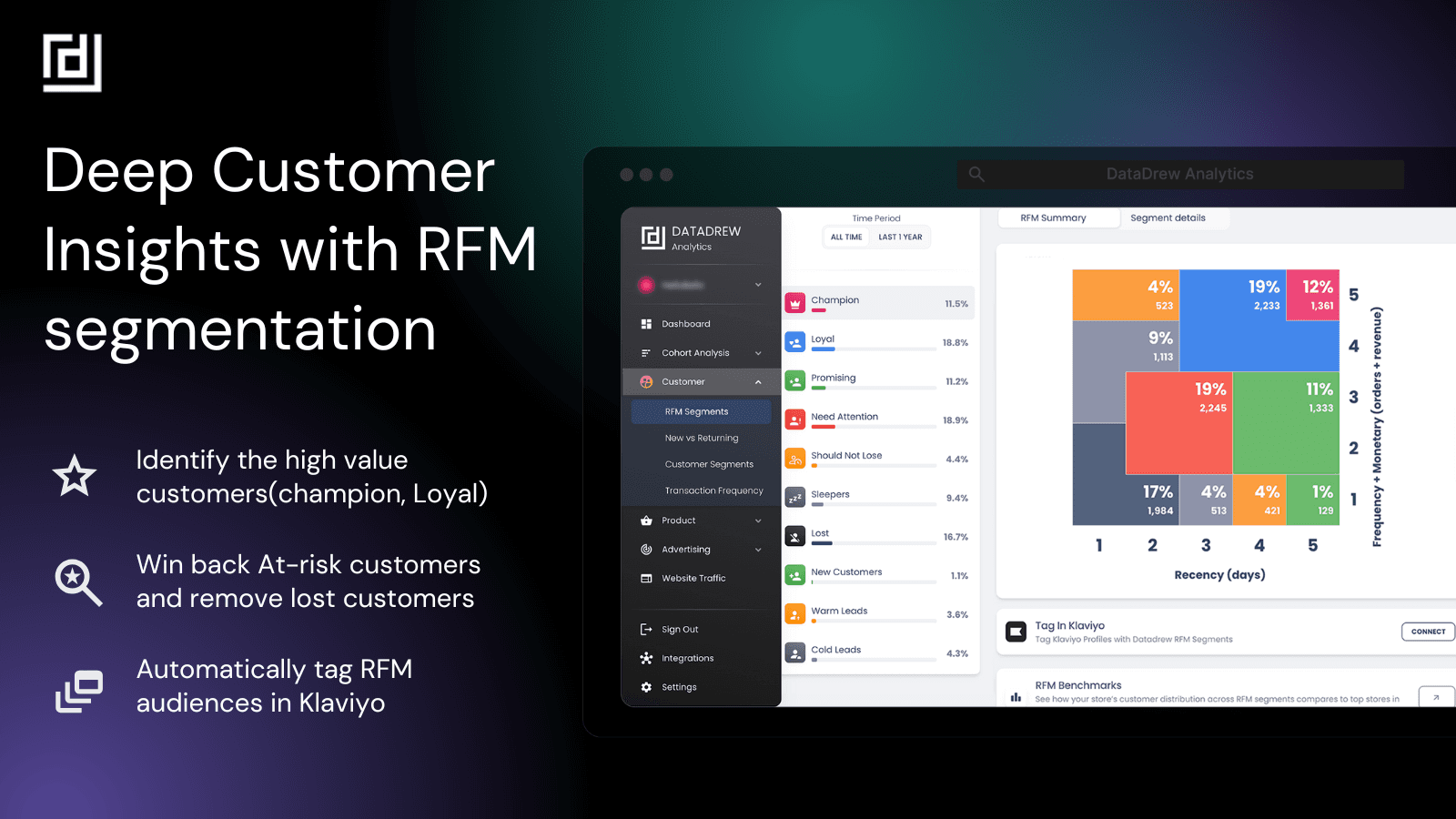 Segment customers by recency, frequency, and spend with RFM analysis. Discover who to retain, reward, and re-engage using DataDrew